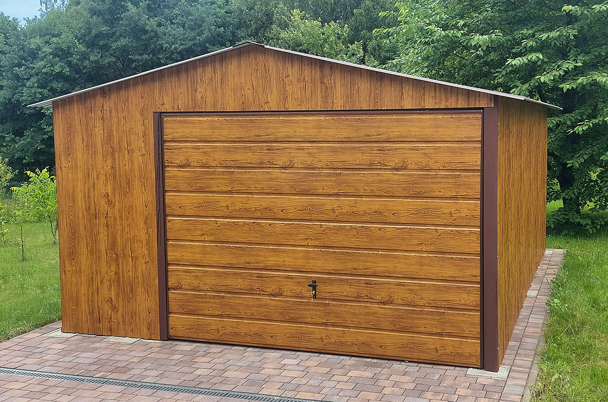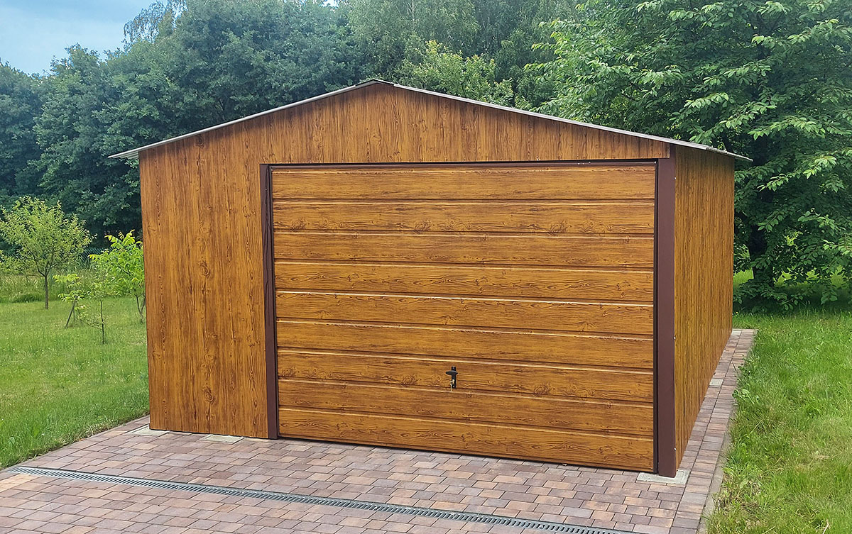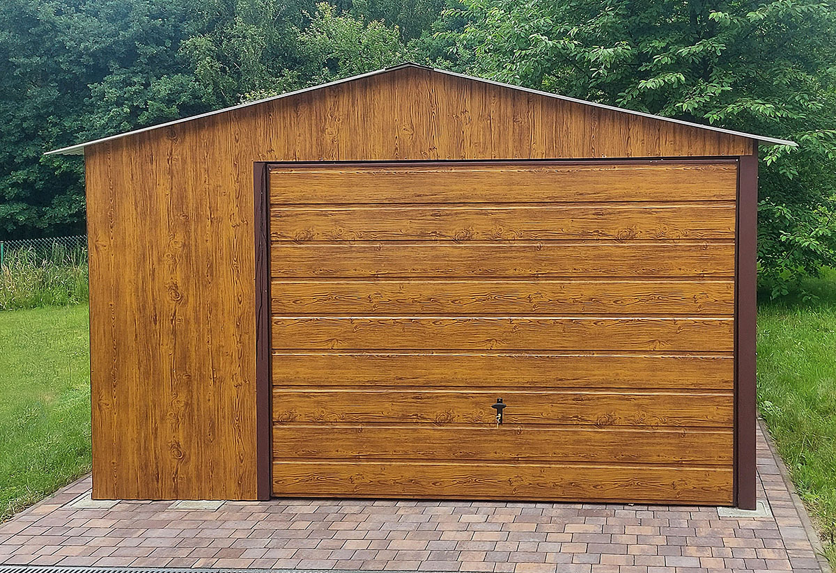 • Ściany wykonane z blachy trapezowej T7 PREMIUM w kolorze Złoty Dąb nadają garażowi niepowtarzalny, elegancki charakter.