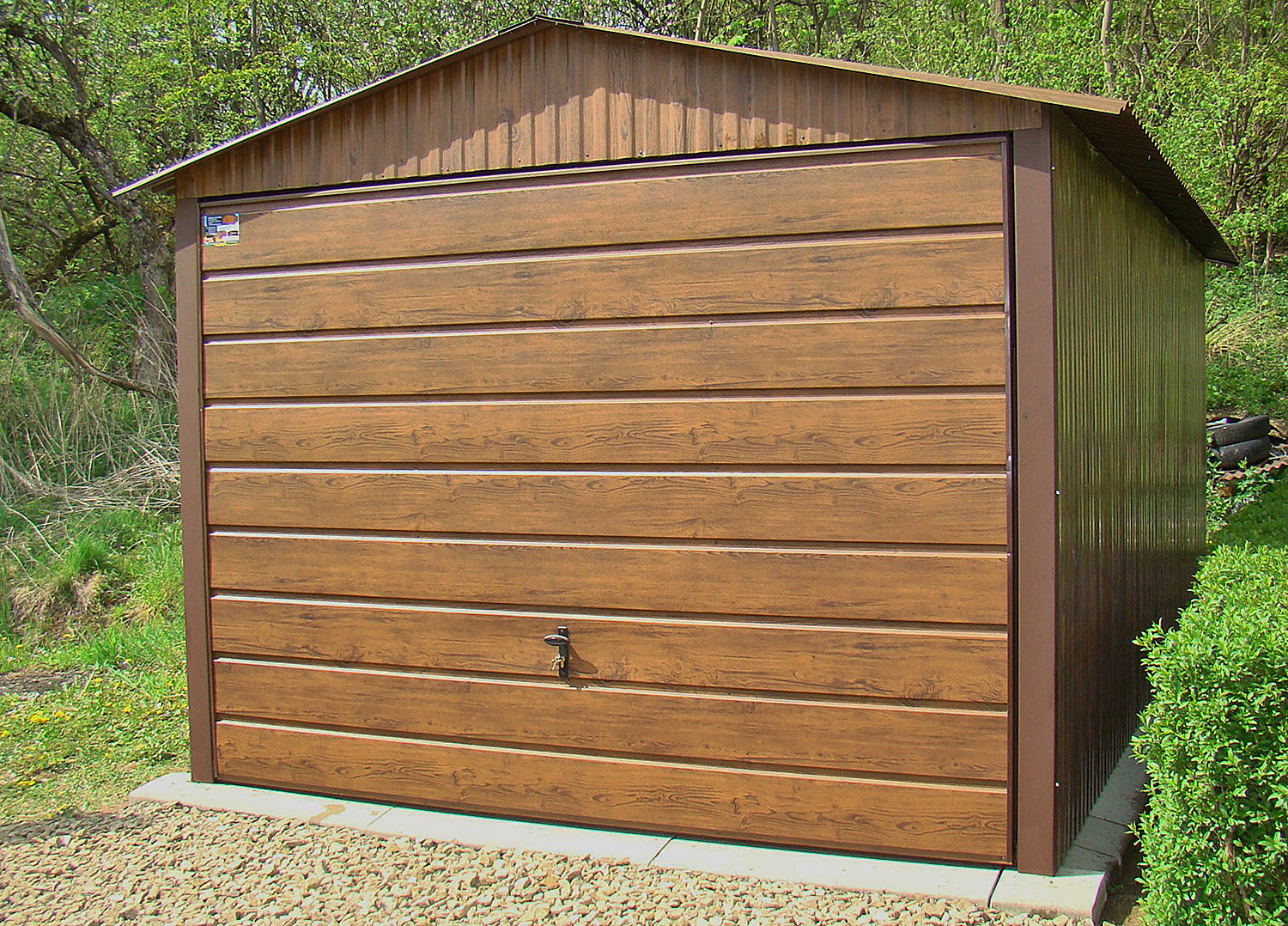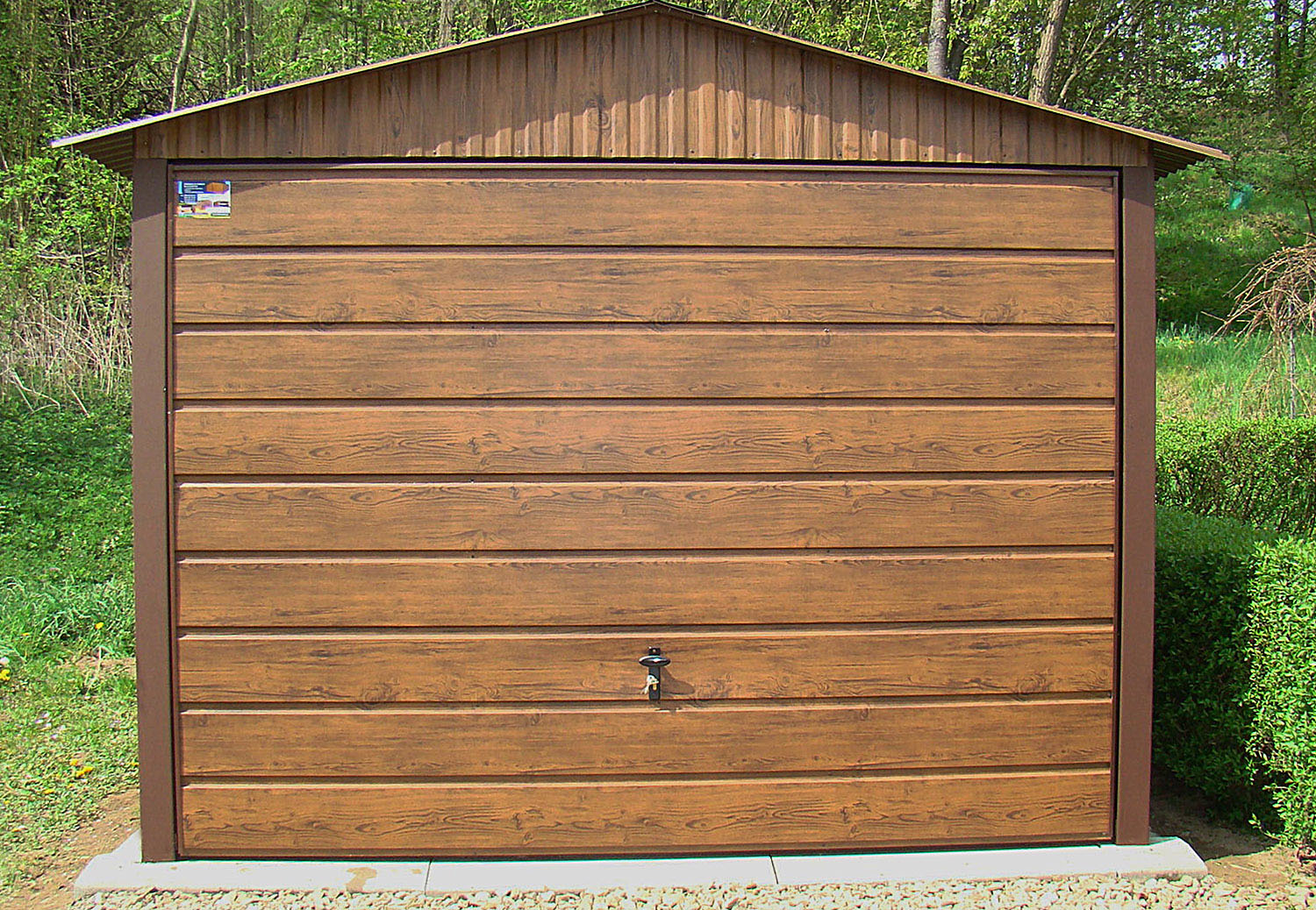 Zapraszamy do zapoznania się z ofertą i zakupu pięknego garażu blaszanego z blachy drewnopodobnej imitującej Orzech o wymiarach 3x5 z dachem dwuspadowym i bramą uchylną z poziomym szerokim panelem.