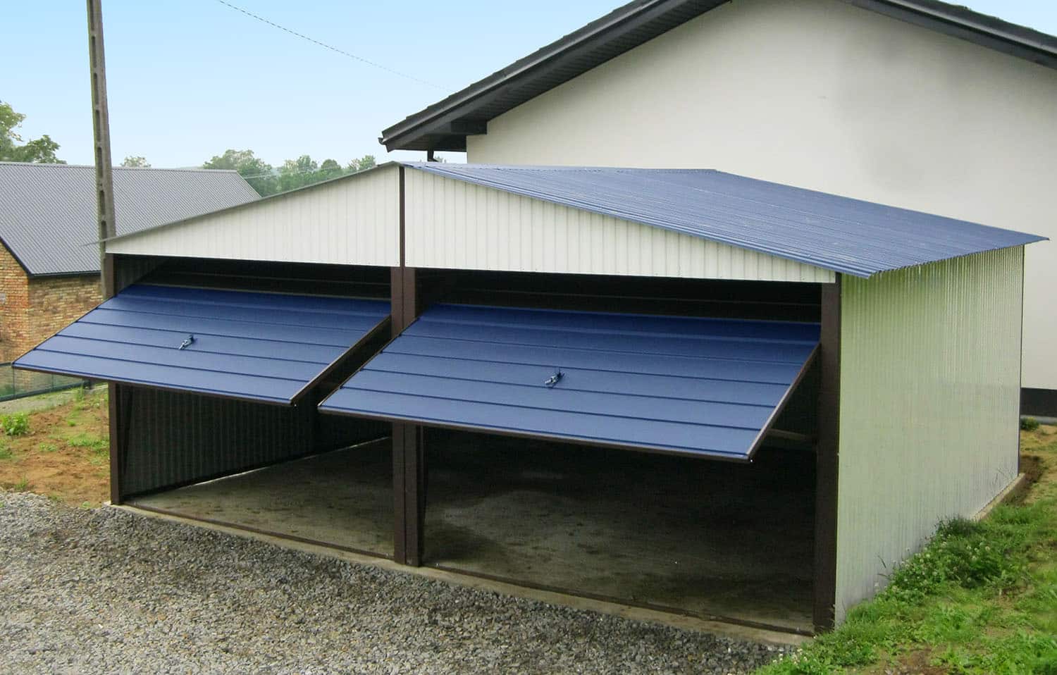 Ściany muszą być z blachy białej, bramy i dach mogą być w innym kolorze jednolitym.